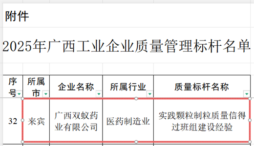 喜讯!双蚁药业“实践颗粒制粒质量信得过班组建设经验”入选2025年广西工业企业质量管理标杆
