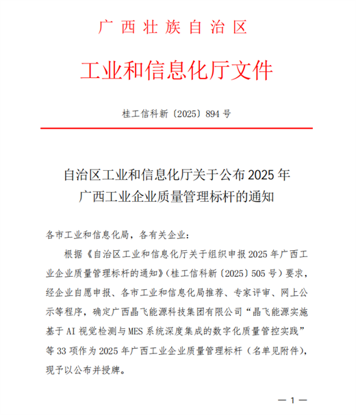 近日,从广西壮族自治区工业和信息化厅传来重磅喜讯——根据《自治区工业和信息化厅关于组织申报2025年广西工业企业质量管理标杆的通知》(桂工信科新〔2025〕505号)要求,经企业自愿申报、各市工业和信息化局推荐、专家评审、网上公示等严格程序,我司“实践颗粒制粒质量信得过班组建设经验”成功入选2025年广西工业企业质量管理标杆名单,获自治区工信厅正式公布并授牌,这是公司在质量管理领域斩获的又一重要荣誉,标志着我司班组建设与质量管控水平获权威认可。