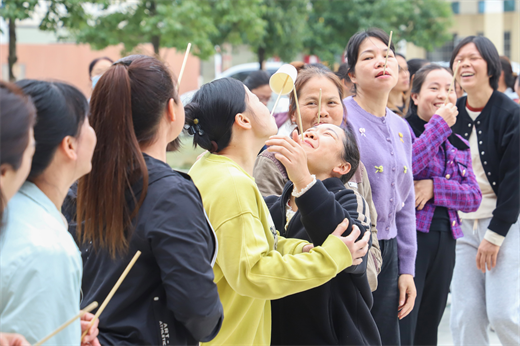 传递纸杯环节,队员们屏息凝神,用嘴含住筷子默契传递纸杯,全程不借助双手,小小纸杯在筷子间平稳传递,考验的是团队配合与专注力;夹纸运书项目中,大家双脚夹纸、头顶书本,稳步接力前行,身姿轻盈又不失稳健,纸张与书本稳稳相伴,默契在脚步间传递;决战水果山趣味十足,两队队员以石头剪刀布决胜,赢者品尝清甜沙糖桔,输者轮换队员再战,20个沙糖桔在欢声笑语中快速“清零”,甜蜜与欢乐洒满赛场;重重叠叠项目里,大家用嘴吹鼓气球,以气球推力将5个空纸杯依次叠放,全员接力完成挑战,技巧与耐心并存,每一次成功叠加都引来阵阵掌声。